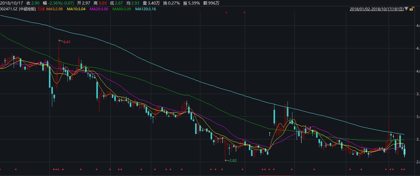 受此影響,截止10月17日上午10時50分許,中超控股股價報(bào)2.9元/股,跌幅2.4%,已經(jīng)接近其年內(nèi)最低價2.82元/股。