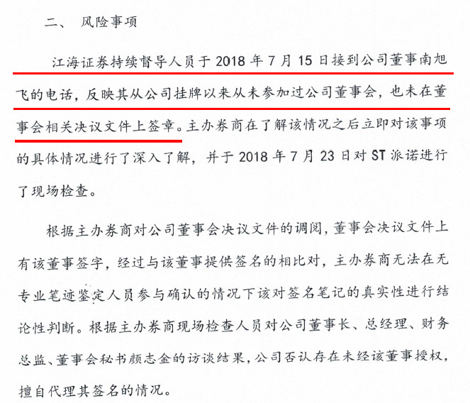 另外,今年7月15日,江海證券持續(xù)督導(dǎo)人員接到ST派諾董事南旭飛的電話,反映其從公司掛牌以來從未參加過公司董事會,也未在董事會相關(guān)決議文件上簽字。