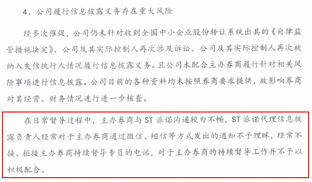 除了不給錢,ST派諾對于主辦券商的持續(xù)督導(dǎo)工作配合也不積極,短信、微信不理不睬,還經(jīng)常拒接主辦券商的電話……