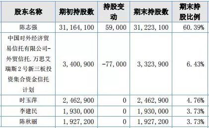 值得一提的是,環(huán)宇裝備2018年半年報顯示,中國對外經(jīng)濟(jì)貿(mào)易信托有限公司-外貿(mào)信托.萬思艾瑞斯2號新三板投資集合資金信托計劃在報告期減持了7.7萬股股份,期末還持有332.39萬股股份。