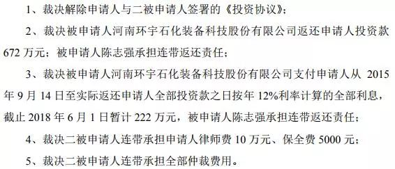 外貿(mào)信托向北京仲裁委員會提起仲裁,請求裁決環(huán)宇裝備及實(shí)控人連帶返還全部投資款,并支付相應(yīng)利息,實(shí)際控制人承擔(dān)連帶返還責(zé)任。