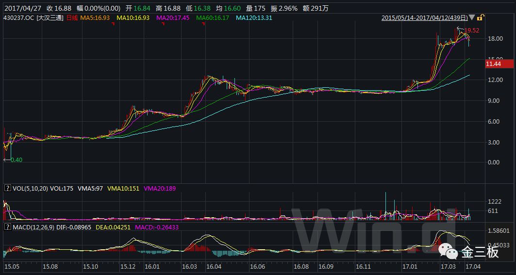 大漢三通股價(jià)從2017年初啟動(dòng),短短三個(gè)月,就從10元/股暴漲到最高時(shí)19.52元/股,幾乎翻倍,公司總市值接近17億元,市盈率超過30倍。