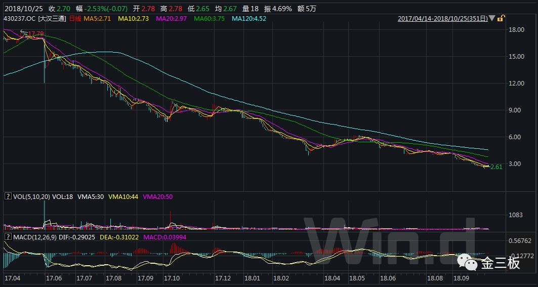 通信行業(yè)的新三板白馬股,大漢三通(430237.OC)近期走勢不佳,10月以來股價(jià)跌去17%,若往前追溯,該股已經(jīng)連續(xù)六個(gè)月股價(jià)下跌,2017年3月高點(diǎn)以來,已下跌近九成。