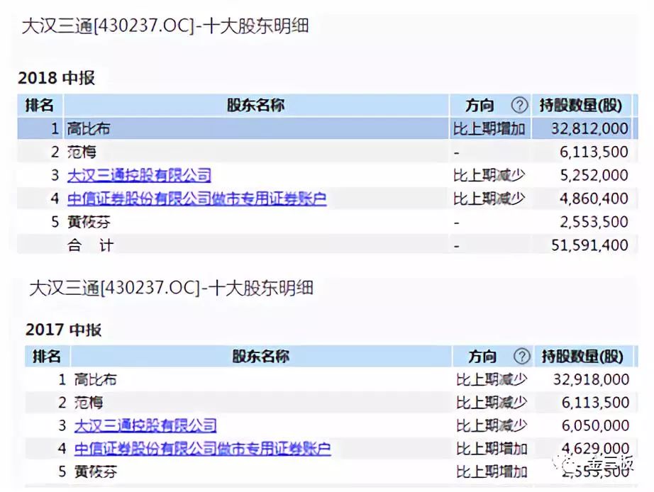 同時(shí),三胖哥發(fā)現(xiàn),由高比布及其妻子黃筱芬控制的公司第三大股東,大漢三通控股有限公司,自2017年以來,累計(jì)減持股份數(shù)量是驚人的90.5萬股,預(yù)估套現(xiàn)金額接近1000萬!