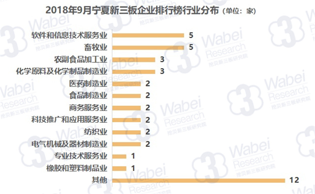 從行業(yè)分布來(lái)看,軟件和信息技術(shù)服務(wù)業(yè)、畜牧業(yè)上榜企業(yè)數(shù)量最多,均有5家企業(yè);其次是農(nóng)副食品加工業(yè)、化學(xué)原料及化學(xué)制品制造業(yè),均有3家企業(yè)。(來(lái)源:挖貝新三板研究院)
