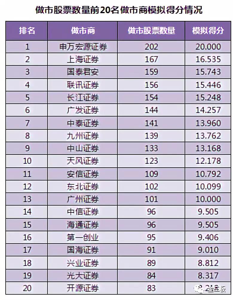 截至目前,做市股票數(shù)量最多的券商,為申萬(wàn)宏源證券,為202支股票提供做市報(bào)價(jià)。而數(shù)量最少的,民族證券、中天證券和長(zhǎng)城國(guó)瑞證券,各自只有1支做市股票。