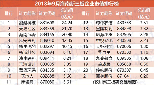 報(bào)告 | 2018年9月海南新三板企業(yè)市值排行榜