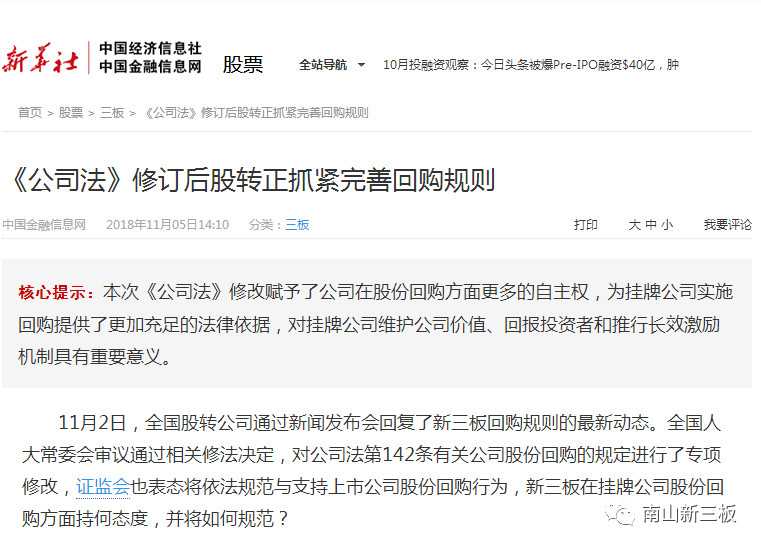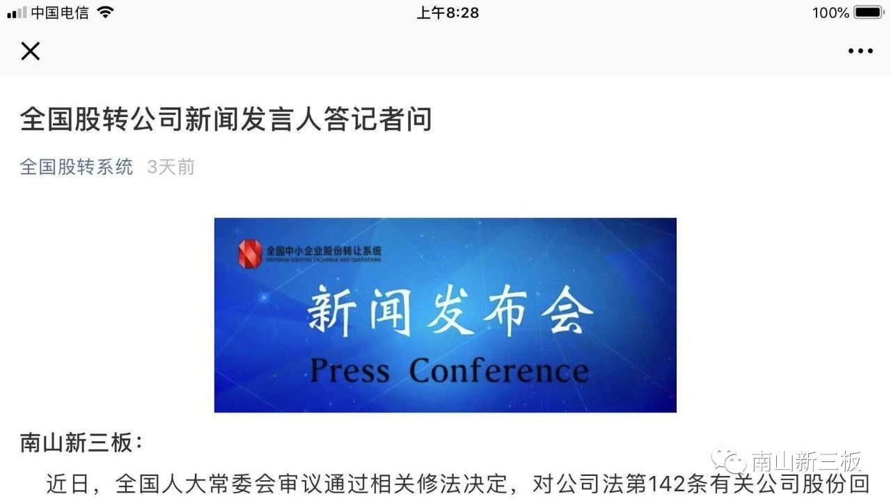 11月2日,全國股轉公司通過新聞發(fā)布會回復了新三板回購規(guī)則的最新動態(tài)。南山新三板問及,全國人大常委會審議通過相關修法決定,對公司法第142條有關公司股份回購的規(guī)定進行了專項修改,證監(jiān)會也表態(tài)將依法規(guī)范與支持上市公司股份回購行為,新三板在掛牌公司股份回購方面持何態(tài)度,并將如何規(guī)范?