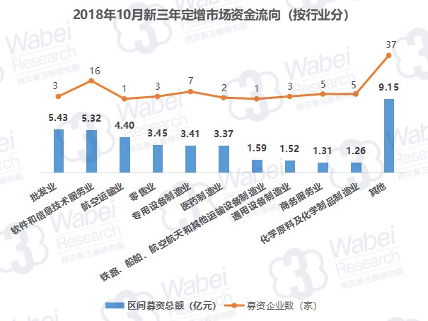 上月,新三板定增市場上,吸引資金最多的行業(yè)是批發(fā)業(yè),共募資5.43億元;其次是軟件和信息技術(shù)服務(wù)業(yè),募資5.32億元。