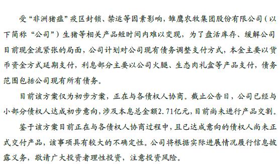 鷹農(nóng)牧稱,為了盤(pán)活庫(kù)存、緩解公司目前現(xiàn)金流緊張的局面,公司計(jì)劃用火腿、生態(tài)肉禮盒等產(chǎn)品支付債務(wù)利息。目前該方案僅為初步方案,正在與各債權(quán)人協(xié)商。截止公告日,公司已經(jīng)與小部分債權(quán)人達(dá)成初步意向,涉及本息總金額2.71億元,目前尚未進(jìn)行產(chǎn)品交割。