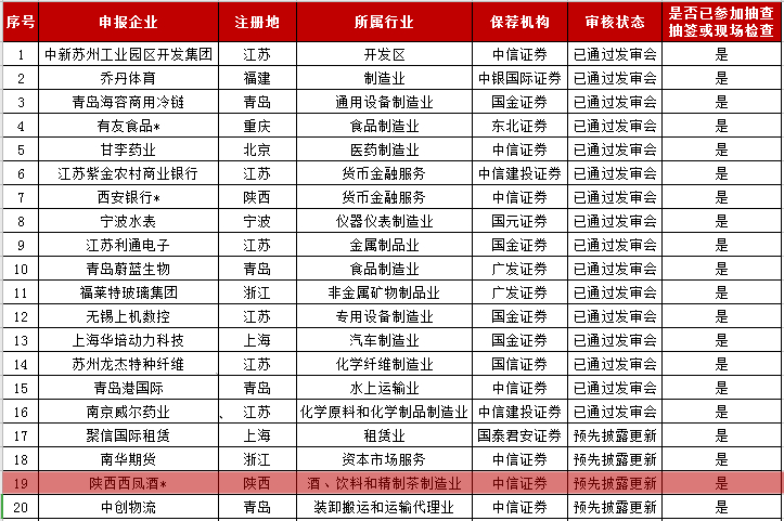本周上交所上交所無(wú)新申報(bào)IPO企業(yè),中止恢復(fù)兩家:陜西西鳳酒和青島百洋醫(yī)藥(新增企業(yè)以藍(lán)色列示,中止恢復(fù)企業(yè)以淺紅色列出,下同)。