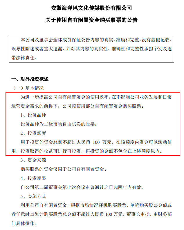 海洋風(fēng)擬使用不超過100萬元人民幣,根據(jù)市場情況擇機(jī)購買二級市場自由買賣的股票。這是最新的一起新三板公司準(zhǔn)備投資炒股案例。