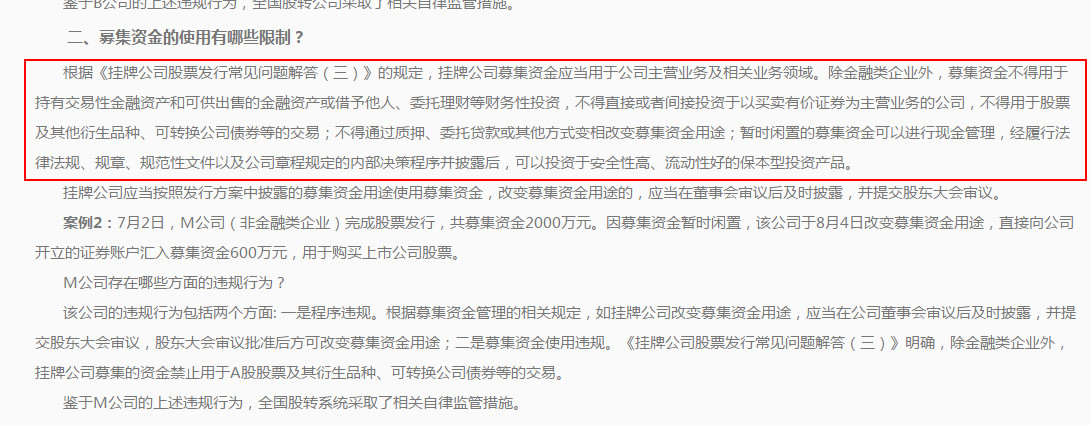 根據(jù)股轉(zhuǎn)公司發(fā)布的規(guī)定,掛牌公司募集資金應(yīng)用于公司主營業(yè)務(wù)及相關(guān)領(lǐng)域。除金融類企業(yè)外,募集資金不得直接或間接投資于以買賣有價證券為主業(yè)的公司,不得用于股票及其他衍生品種、可轉(zhuǎn)換公司債券等的交易。