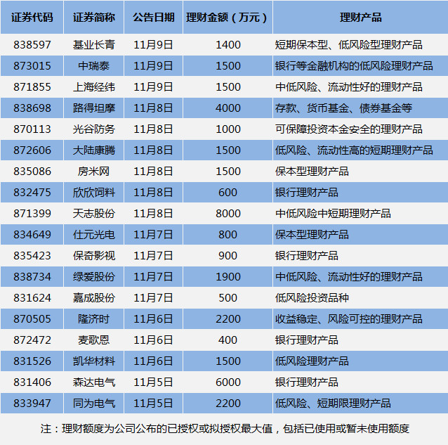 據(jù)記者統(tǒng)計,僅在11月5日-11日9日一周內(nèi),就有18家新三板公司公告擬投資或授權(quán)投資購買各類理財產(chǎn)品,擬使用的資金合計達(dá)3.74億元。
