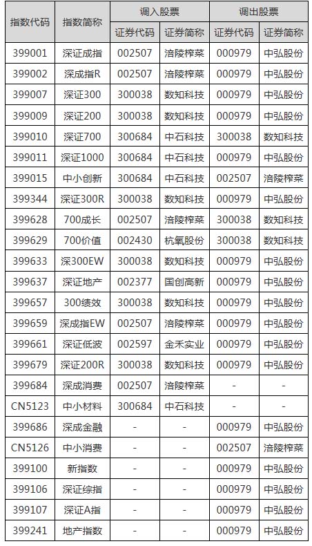 深交所表示,鑒于中弘股份(000979)即將終止上市,根據(jù)指數(shù)編制規(guī)則,深圳證券交易所和深圳證券信息有限公司決定于2018年11月16日對(duì)深證成指、中小創(chuàng)新等指數(shù)樣本股進(jìn)行臨時(shí)調(diào)整,具體如下: