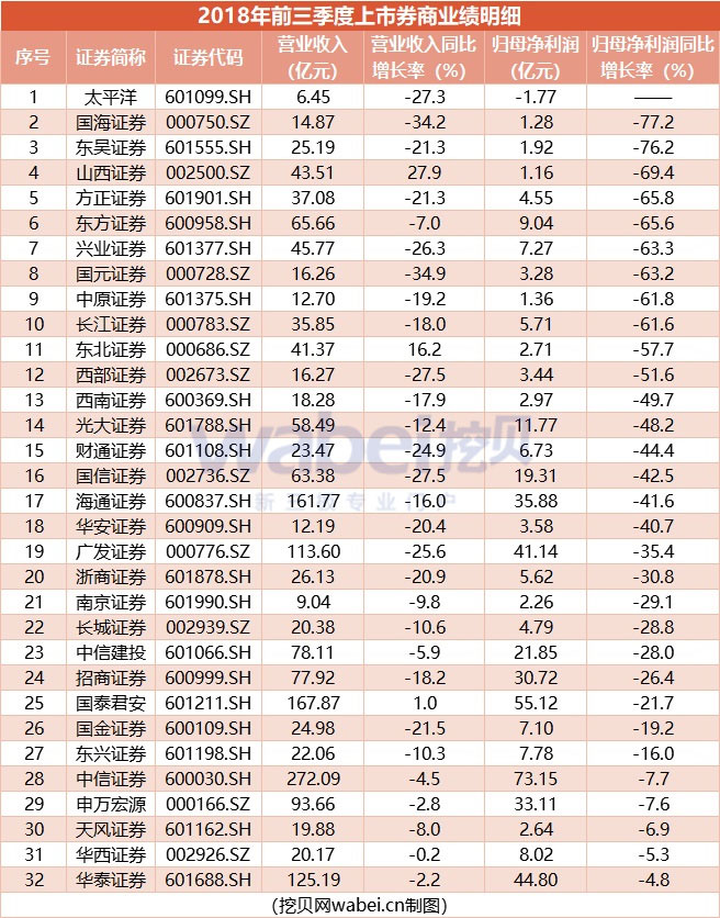 挖貝研究院數(shù)據(jù)顯示,32家上市券商前三季度利潤同比全部下跌。10月份數(shù)據(jù)更為糟糕,當(dāng)月有6家券商虧損,而1-9月虧損的券商只有太平洋證券。