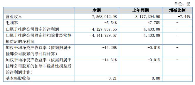 報告期內(nèi)公司主營業(yè)務(wù)收入總額7,568,912.98元,較上年同期8,177,394.09元下降8.04%;公司實現(xiàn)凈利潤-4,127,837.55元,較上年同期-4,403.08元大幅下降?。